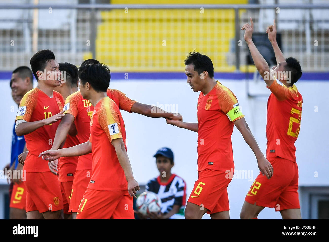 Players of China national football team celebrate after scoring against Kyrgyzstan national