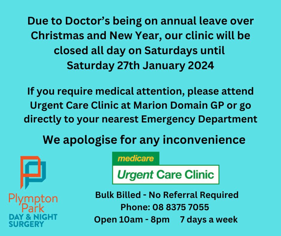 8:30 am - 5:00 pm. Saturday. 1:00 pm - 5:00 pm. Sunday. Closed. (Subject to change without notice due to doctor availability) Public holidays: 9.00am - 5.00pm (subject to doctor availability) CLOSED Christmas Day. We are a family oriented General Practice Doctors Surgery in the centre of Plympton Park, South Australia, servicing Plympton, South.